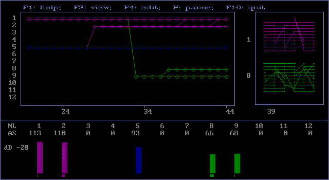At the left part vertically - the numbers of licenses, at the center area - horizontal lines represent not empty licenses, diagonal lines mean migrations of new evolutionary forms between licenses. At the right area - the same events in licenses 1 and 8 in details after 39 cycles. Lines represent fragments of evolutionary trees disposed horizontally. Bifurcation can happen after appearance of mutant. |
