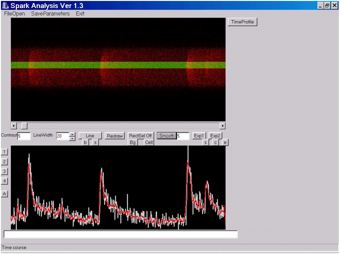 The program estimates the amplitudes, widths, rise and decay times of Ca2+ sparks.